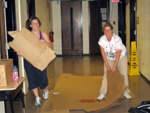 Twenty-two new whiteboards, plus two 16 foot ones that had been donated two years previously and no one had been able to move them upstairs. The first meeting of our Latin America Holistic Ministry team took place in New Orleans and we set aside a day for team-building by enjoying the refreshing climate of New Orleans in August. The team took on two projects, one taping and mudding a house and one helping a school in one of the poorest areas of the city. Cathi and one of our newest missionaries, Sue Jenkins, found a creative way to move these huge boxes that once covered the whiteboards.