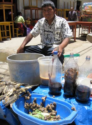 The birds on the left are cooked with some unidentifiable vegetation in the pot and served to passing customers in this market day in Tarma Peru. The resulting stew is supposed to improve brainpower. The little critters trying to escape from the plastic bin are snails, guaranteed to improve your muscles. Don’t even ask what is in the pitcher and bottles. There is such a thing as too much information.