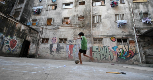 A child plays in the courtyard of an abandoned building that his family and a hundred others invaded to stay off the streets.